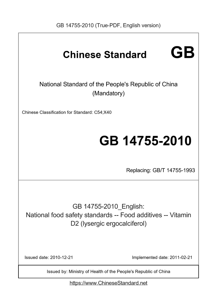 Delivery: <= 3 days. True-PDF full-copy in English will be manually translated and delivered via email. GB 14755-2010: National food safety standards -- Food additives -- Vitamin D2 (lysergic ergocalciferol) Status: Valid GB 14755: Historical versions