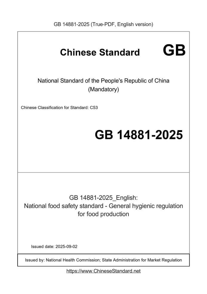Delivery: <= 5 days. True-PDF full-copy in English will be manually translated and delivered via email. GB 14881-2025: National food safety standard - General hygienic regulation for food production Status: Valid GB 14881: Historical versions