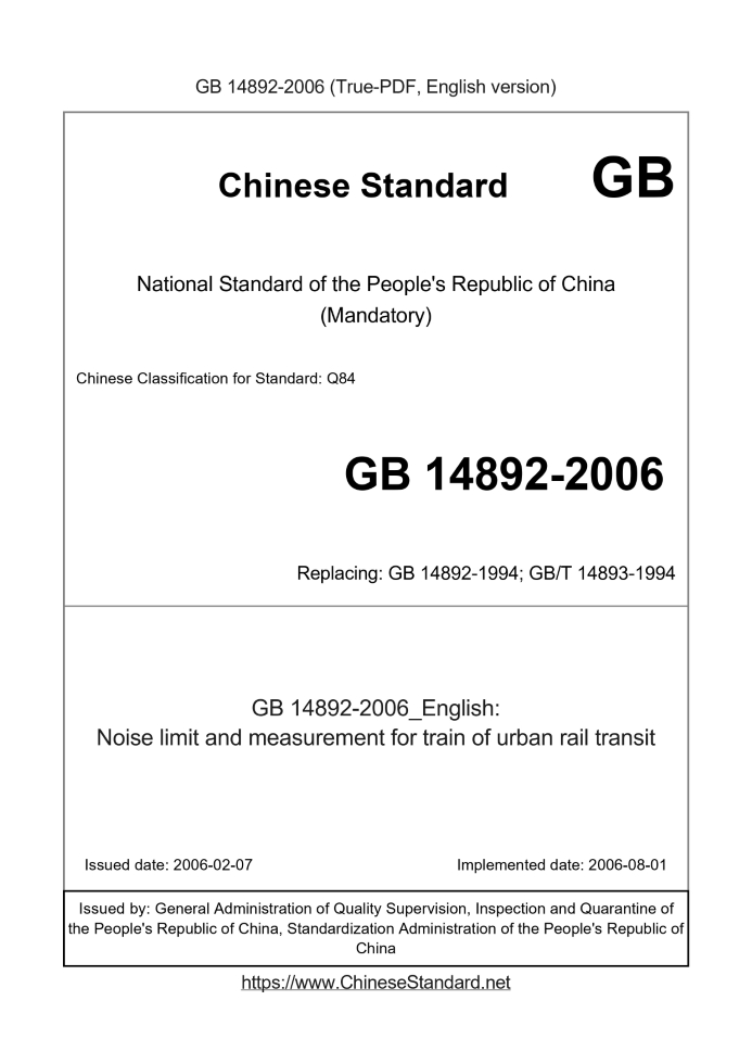GB 14892-2006: Noise limit and measurement for train of urban rail transit