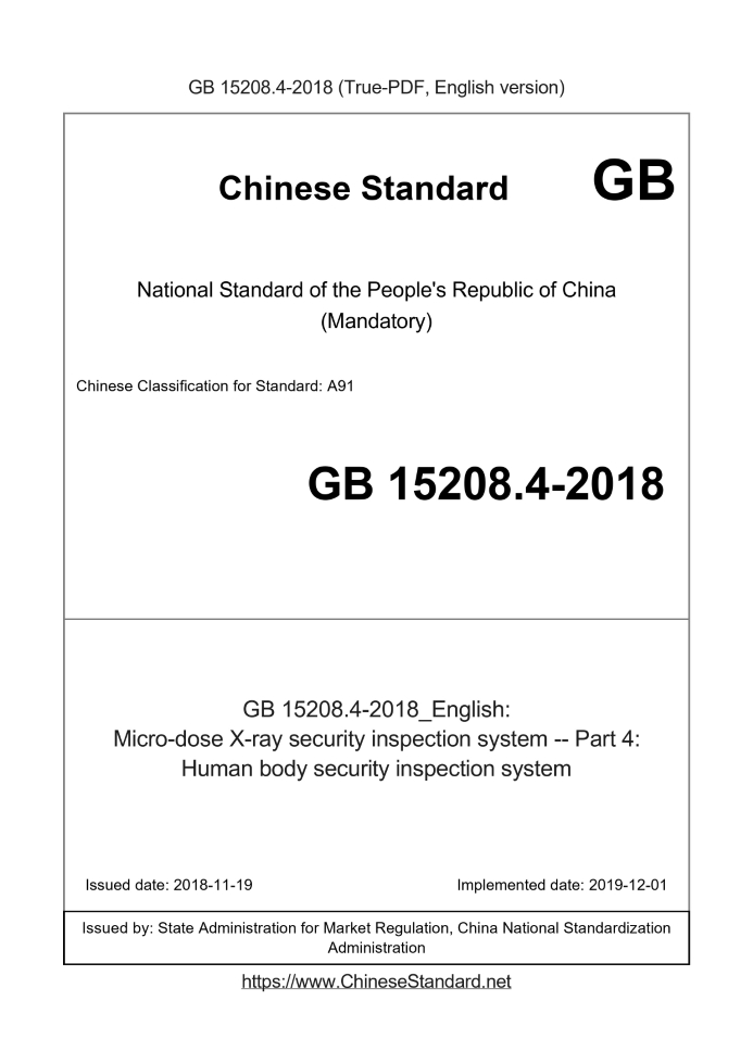 Delivery: <= 5 days. True-PDF full-copy in English will be manually translated and delivered via email. GB 15208.4-2018: Micro-dose X-ray security inspection system -- Part 4: Human body security inspection system Status: Valid