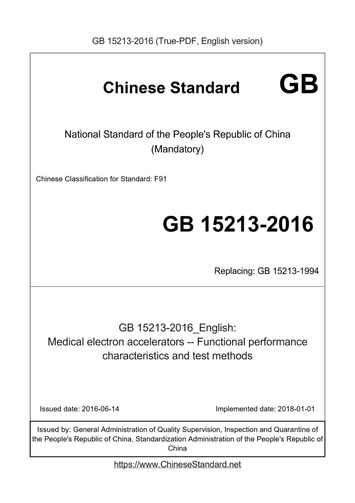 Delivery: <= 13 days. True-PDF full-copy in English will be manually translated and delivered via email. GB 15213-2016: Medical electron accelerators -- Functional performance characteristics and test methods Status: Valid GB 15213: Historical versions