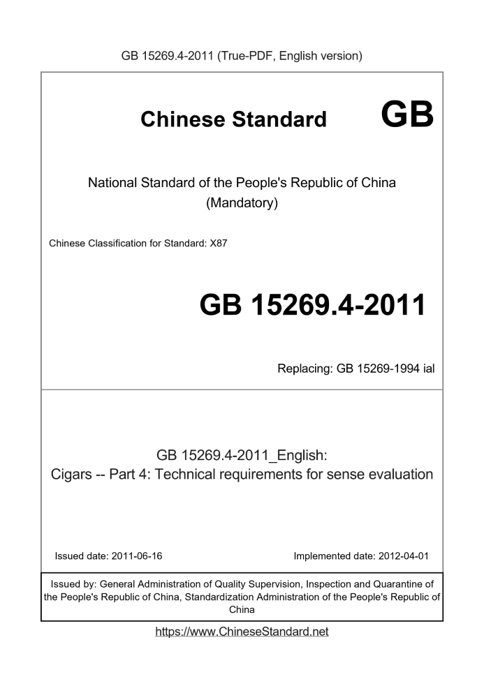 Delivery: <= 3 days. True-PDF full-copy in English will be manually translated and delivered via email. GB 15269.4-2011: Cigars -- Part 4: Technical requirements for sense evaluation Status: Valid