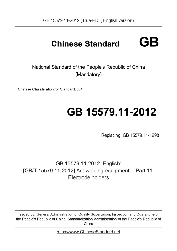 Delivery: <= 3 days. True-PDF full-copy in English will be manually translated and delivered via email. GB 15579.11-2012: [GB/T 15579.11-2012] Arc welding equipment -- Part 11: Electrode holders Status: Valid GB 15579.11: Historical versions