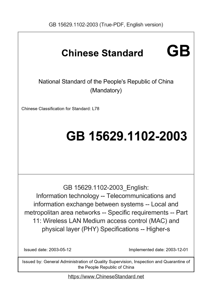 Delivery: <= 10 days. True-PDF full-copy in English will be manually translated and delivered via email. GB 15629.1102-2003: Information technology -- Telecommunications and information exchange between systems -- Local and metropolitan area networks -- Specific requirements -- Part 11: Wireless LAN Medium access control (MAC) and physical layer (PHY) Specifications -- Higher-s Status: Valid