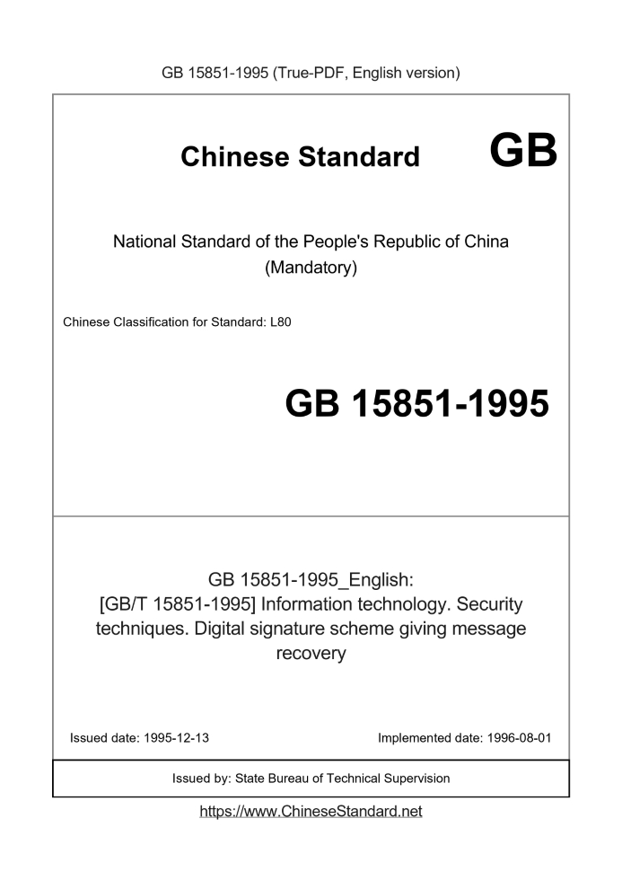 Delivery: <= 5 days. True-PDF full-copy in English will be manually translated and delivered via email. GB 15851-1995: [GB/T 15851-1995] Information technology. Security techniques. Digital signature scheme giving message recovery Status: Obsolete