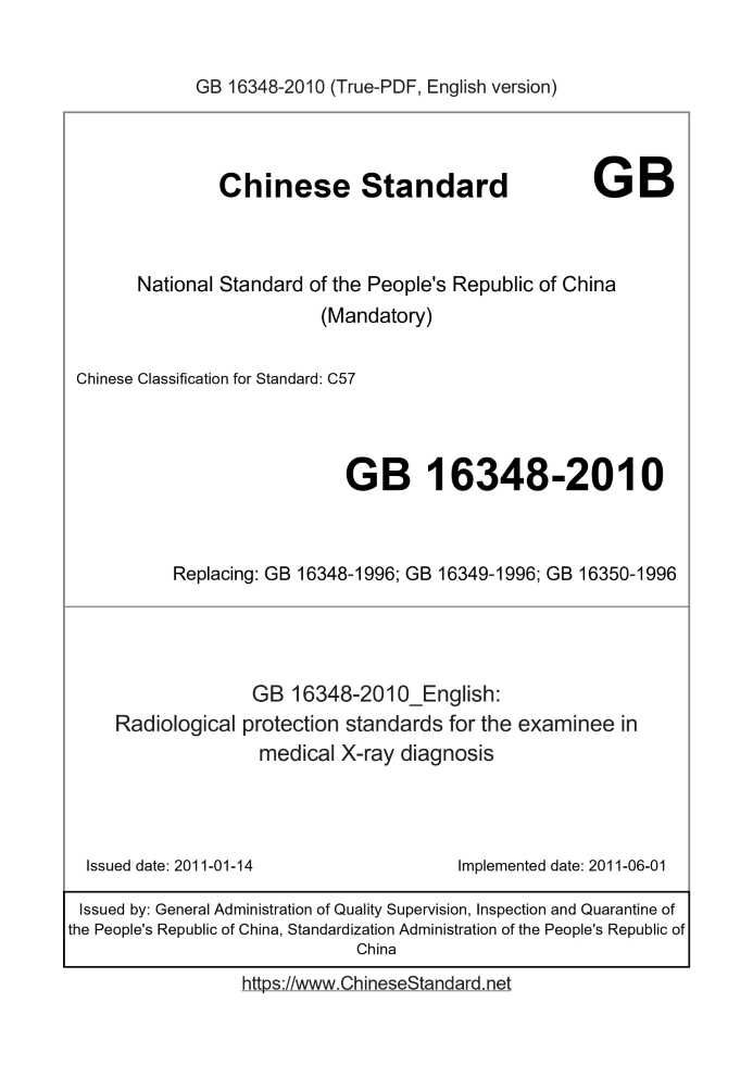 Delivery: <= 3 days. True-PDF full-copy in English will be manually translated and delivered via email. GB 16348-2010: Radiological protection standards for the examinee in medical X-ray diagnosis Status: Valid GB 16348: Historical versions