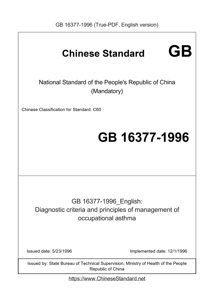 Delivery: <= 3 days. True-PDF full-copy in English will be manually translated and delivered via email. GB 16377-1996: Diagnostic criteria and principles of management of occupational asthma Status: Obsolete