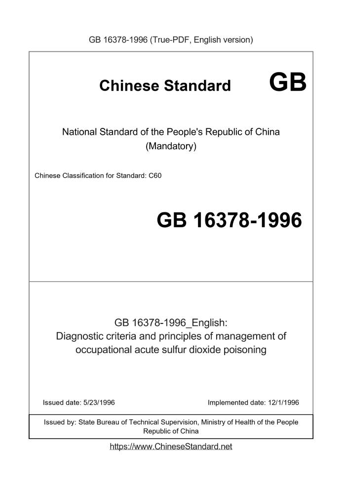 Delivery: <= 2 days. True-PDF full-copy in English will be manually translated and delivered via email. GB 16378-1996: Diagnostic criteria and principles of management of occupational acute sulfur dioxide poisoning Status: Obsolete