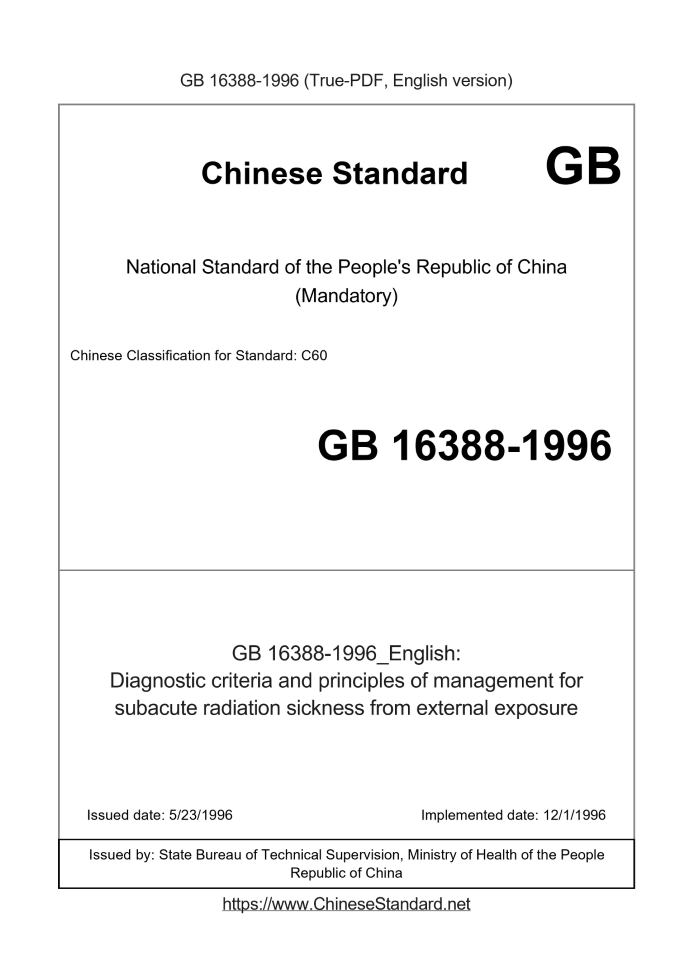 Delivery: <= 2 days. True-PDF full-copy in English will be manually translated and delivered via email. GB 16388-1996: Diagnostic criteria and principles of management for subacute radiation sickness from external exposure Status: Obsolete
