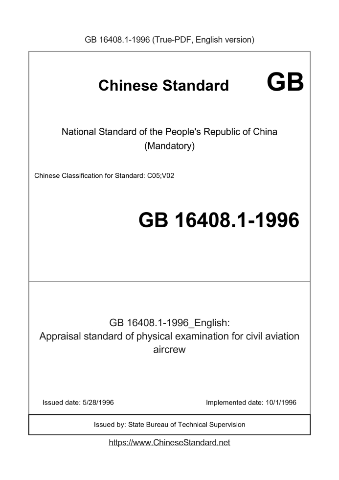 Delivery: <= 4 days. True-PDF full-copy in English will be manually translated and delivered via email. GB 16408.1-1996: Appraisal standard of physical examination for civil aviation aircrew Status: Obsolete