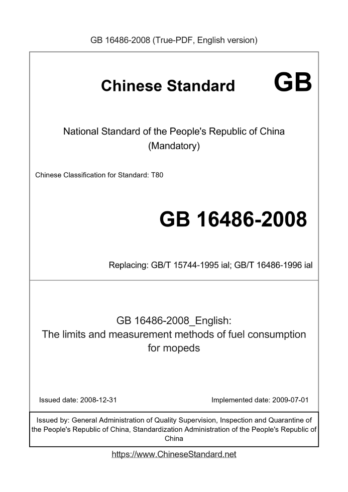 Delivery: <= 3 days. True-PDF full-copy in English will be manually translated and delivered via email. GB 16486-2008: The limits and measurement methods of fuel consumption for mopeds Status: Obsolete GB 16486: Historical versions