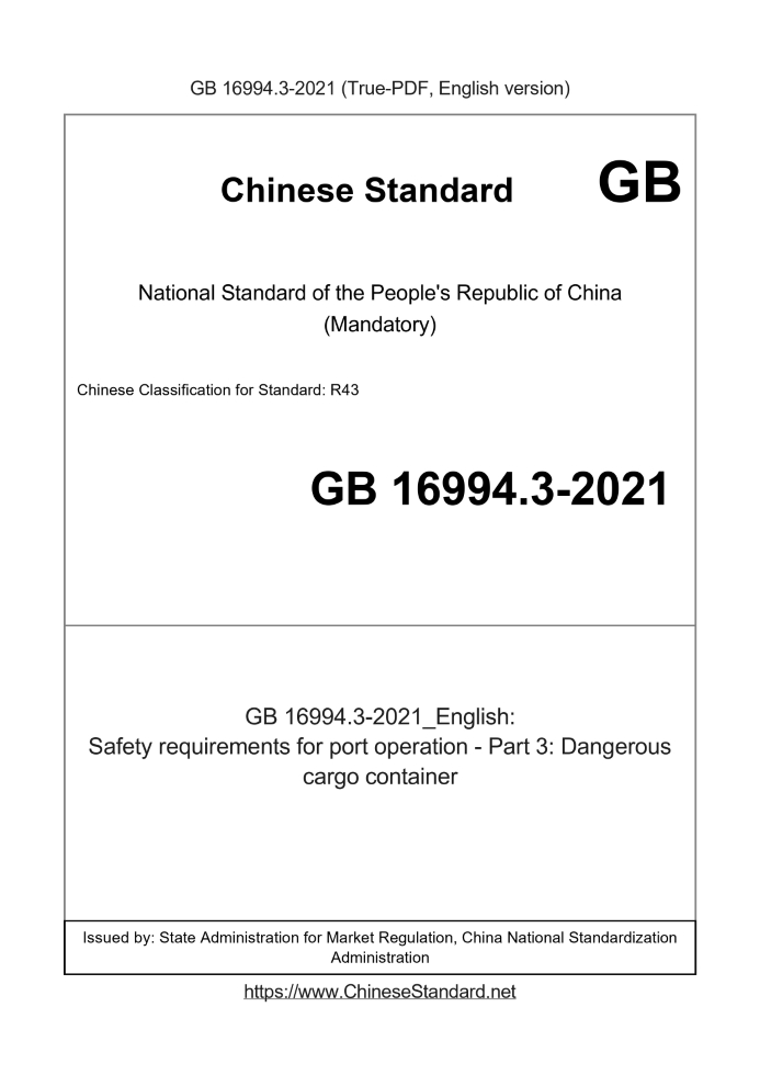 Delivery: <= 3 days. True-PDF full-copy in English will be manually translated and delivered via email. GB 16994.3-2021: Safety requirements for port operation - Part 3: Dangerous cargo container Status: Valid