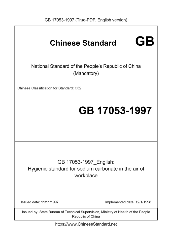 Delivery: <= 2 days. True-PDF full-copy in English will be manually translated and delivered via email. GB 17053-1997: Hygienic standard for sodium carbonate in the air of workplace Status: Obsolete