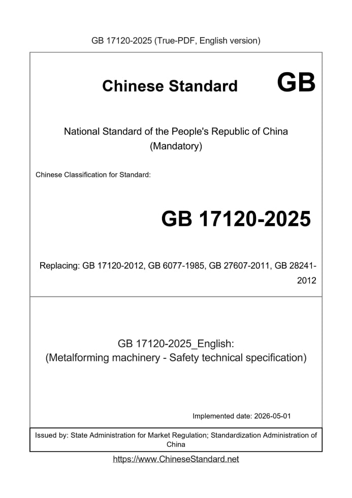 Basic dataStandard ID: GB 17120-2025 (GB17120-2025)Description (Translated English): (Metalforming machinery - Safety technical specification) Sector / Industry: National Standard Date of Implementation: 2026-05-01 Older Standard (superseded by this standard): GB 17120-2012, GB 6077-1985, GB 27607-2011, GB 28241-2012 Issuing agency(ies): State Administration for Market Regulation; Standardization Administration of China GB 17120-2012: Metal forming machinery -- Safety requirements---This is a DRAFT version for illustration, not a final translation. Full copy of true-PDF in English version (including equations, symbols, images, flow-chart, tables, and figures etc.) will be manually/carefully translated upon your order.Metalforming machinery.Safety requirements ICS 25.120.10 J62 National Standards of People's Republic of China Replacing GB 17120-1997 Metalforming machinery - Safety requirements Issued on. 2012-11-05 2013-10-01 implementation Administration of Quality Supervision, Inspection and Quarantine of People's Republic of China Standardization Administration of China released ForewordChapter 4 of this standard are recommended, the rest are mandatory. This standard was drafted in accordance with GB/T 1.1-2009 given rules. This standard replaces GB 17120-1997 "Metalforming machinery - Safety requirements" This standard compared with GB 17120-1997, the main technical changes are as follows. --- Removed and added the normative references; --- Modify the terms and definitions; --- Increased in Chapter 4; --- Increasing the noise requirements (see 5.11); --- Increased emission requirements (see 5.14); --- Increased requirements for substances and materials (see 5.15); --- Increased Ergonomic requirements (see 5.16); --- Delete the design and construction requirements for machine parts (see the 1997 edition 4.2); --- Remove the balance check request (see 1997 edition 5.4); --- Remove the brake angle requirements (see the 1997 version 6.2.3); --- Remove the adjusting device Die height requirements (see the 1997 edition of Chapter 8); --- Changed hands to manipulate the requirements (see 5.6.6); --- Modify the requirements for emergency stop devices (see 5.6.9); --- Modify the requirements for protection devices (see 5.17.3); --- Modify the working platform, channel or straight ladder ladder and guardrail requirements (see 5.18); --- Modify the use of information requirements (see Chapter 6). The standard proposed by China Machinery Industry Federation. This standard by the National Forging Machinery Standardization Technical Committee (SAC/TC220) centralized. This standard is drafted by. Jinan Foundry and Metalforming Machinery Research Institute Co., Taian Hualu Metalforming Machine Co., Ltd., Qingdao Green forging Forging Machinery Co., Ltd. The main drafters of this standard. Ma Liqiang, Yin Shengjun, the king made strong, Xingji Bo. This standard replaces the standards previously issued as follows. --- GB 17120-1997; --- JB4203-1986 Metalforming machinery - Safety requirements1 ScopeThis standard specifies the safety requirements for forging machinery design, manufacture and use. This standard applies to forging machinery.2 Normative referencesThe following documents for the application of this document is essential. For dated references, only the dated version suitable for use herein Member. For undated references, the latest edition (including any amendments) applies to this document. GB 150 (all parts) pressure vessel GB 2893 Safety colors GB 2894 Safety Signs and use guidelines GB/T 3766-2001 Hydraulic System General technical conditions GB 4584 presses photoelectric protection device technology GB 5083 production equipment with safety and health General GB 5092 press induction type safety device technology GB 5226.1-2008 Safety of machinery - Electrical machinery and electrical equipment - Part 1. General requirements GB 7247.1 Safety of laser products - Part 1. Equipment Classification, Requirements and User's Guide GB/T 7932-2003 General technical conditions of pneumatic systems GB/T 14776 Ergonomic design principles job size and value GB/T 15241.2 related to mental workload ergonomic principles - Part 2. Design Principles GB/T 15706.1-2007 Safety of machinery - Basic concepts, general principles for design - Part 1. Basic terminology, methodology GB/T 15706.2-2007 Safety of machinery - Basic concepts, general principles for design - Part 2. Technical principles Ergonomic principles GB/T 16251 design of work systems GB 16754 Safety of machinery - Emergency stop design principles GB/T 16855.1 machinery safety control system relating to safety components - Part 1. General principles for design GB/T 16856.1 Safety of machinery - Risk assessment - Part 1. Principles GB 17888.1 Safety of machinery stationary facilities - Part 1. Choice of fixed means of access between two planes GB 17888.2 Safety of machinery stationary facilities - Part 2. Working platforms and gangways GB 17888.3 Safety of machinery stationary facilities - Part 3. Stairs, steps and guardrails GB 17888.4 Safety of machinery stationary facilities - Part 4. Fixed ladders Requires the operator to the location and operation. GB 18209.3 Safety of machinery - Indication, marking and actuation - Part 3 GB/T 18569.1 Safety of machinery decreased from hazardous substances emitted by machinery health risk - Part 1. mechanical system for Manufacturer of the principles and norms GB/T 19671 Safety of machinery - hand control devices - Functional aspects and design principles Location GB/T 19876 Safety of machinery and parts of the body close to the speed-related safety devices GB/T 23281 Forging Machinery noise level measurement method GB/T 23282 forging machinery sound power level measurement3 Terms and DefinitionsGB/T 15706.1 as defined in the following terms and definitions apply to this document. 3.1 JHA area hazardzoneofworking Completion of the regional workpiece on forging machinery. As for the working parts from time to t