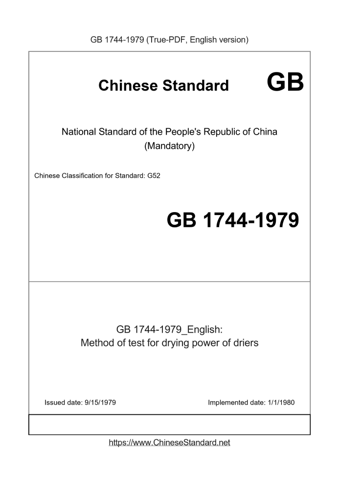 Delivery: <= 2 days. True-PDF full-copy in English will be manually translated and delivered via email. GB 1744-1979: Method of test for drying power of driers Status: Obsolete