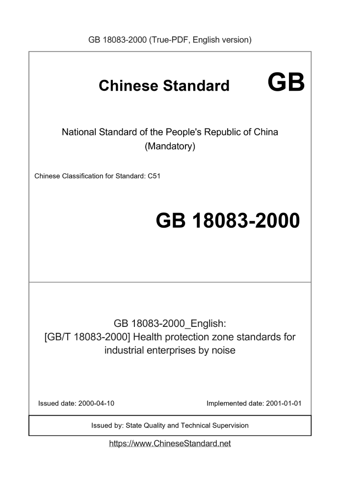 Delivery: <= 2 days. True-PDF full-copy in English will be manually translated and delivered via email. GB 18083-2000: [GB/T 18083-2000] Health protection zone standards for industrial enterprises by noise Status: Valid