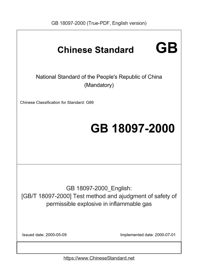 Description (Translated English): [GB/T 18097-2000] Test method and ajudgment of safety of permissible explosive in inflammable gas