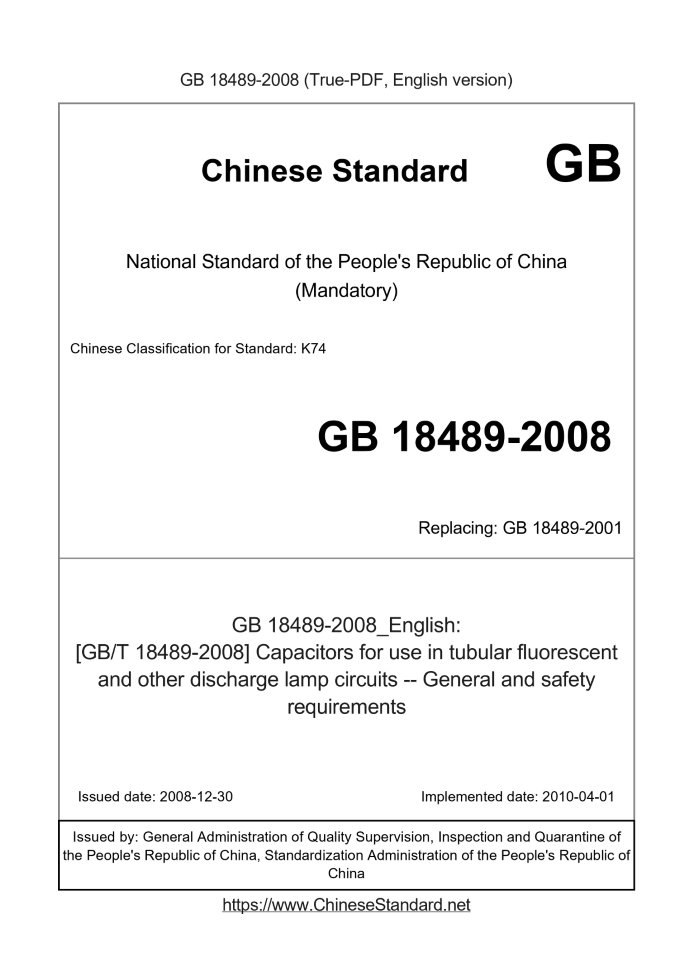 Delivery: <= 5 days. True-PDF full-copy in English will be manually translated and delivered via email. GB 18489-2008: [GB/T 18489-2008] Capacitors for use in tubular fluorescent and other discharge lamp circuits -- General and safety requirements Status: Valid GB 18489: Historical versions