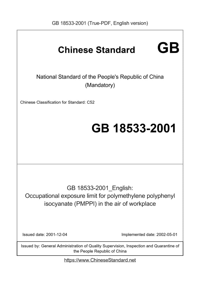 Delivery: <= 2 days. True-PDF full-copy in English will be manually translated and delivered via email. GB 18533-2001: Occupational exposure limit for polymethylene polyphenyl isocyanate (PMPPI) in the air of workplace Status: Obsolete