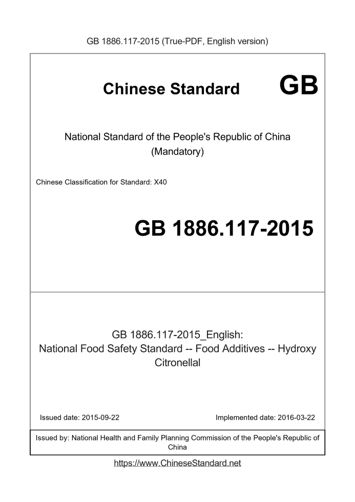 Delivery: <= 3 days. True-PDF full-copy in English will be manually translated and delivered via email. GB 1886.117-2015: National Food Safety Standard -- Food Additives -- Hydroxy Citronellal Status: Valid