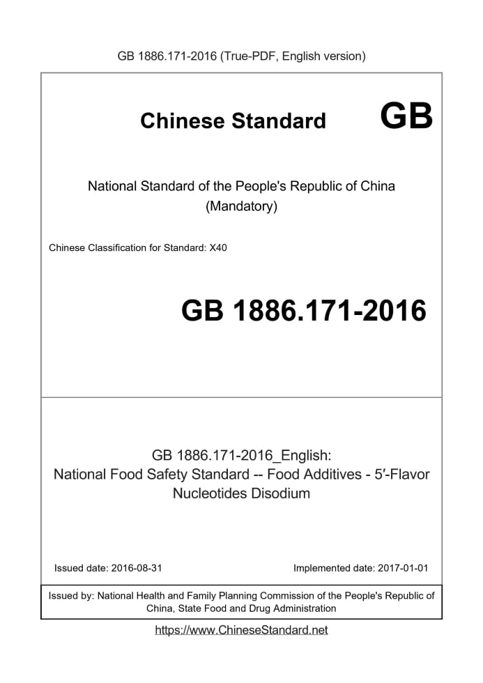 Delivery: <= 3 days. True-PDF full-copy in English will be manually translated and delivered via email. GB 1886.171-2016: National Food Safety Standard -- Food Additives - 5′-Flavor Nucleotides Disodium Status: Valid