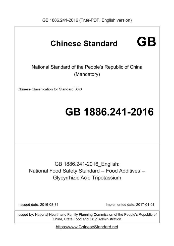 Delivery: <= 3 days. True-PDF full-copy in English will be manually translated and delivered via email. GB 1886.241-2016: National Food Safety Standard -- Food Additives -- Glycyrrhizic Acid Tripotassium Status: Valid