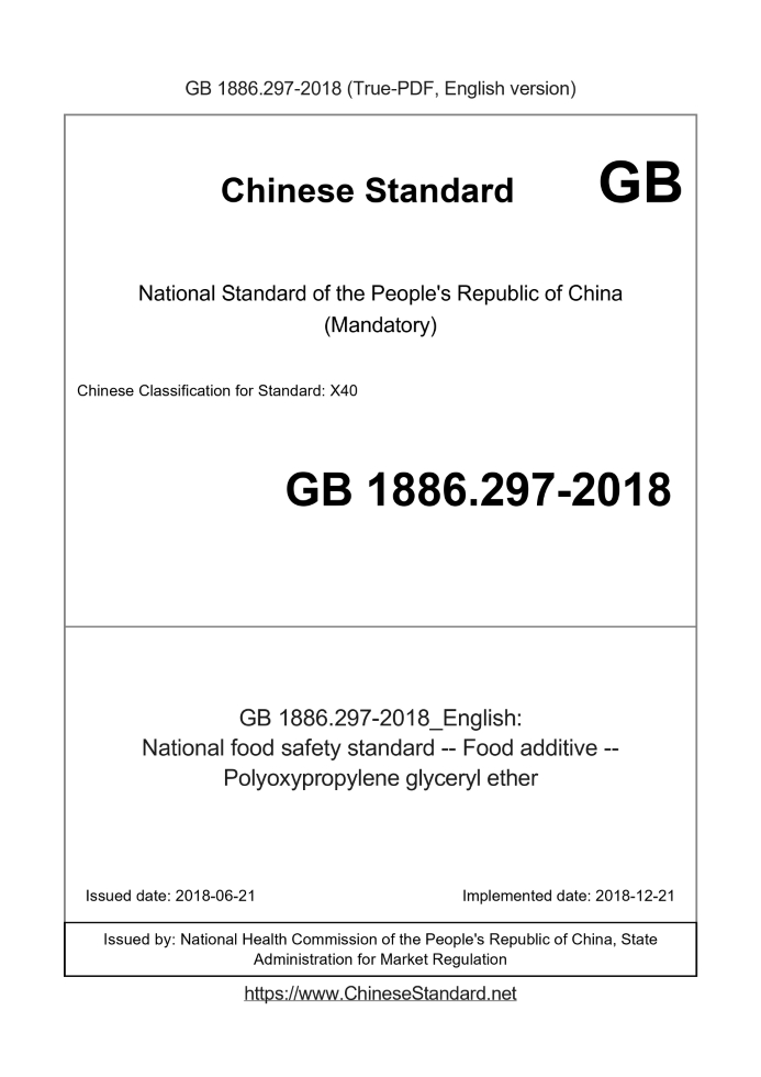 Delivery: <= 3 days. True-PDF full-copy in English will be manually translated and delivered via email. GB 1886.297-2018: National food safety standard -- Food additive -- Polyoxypropylene glyceryl ether Status: Valid