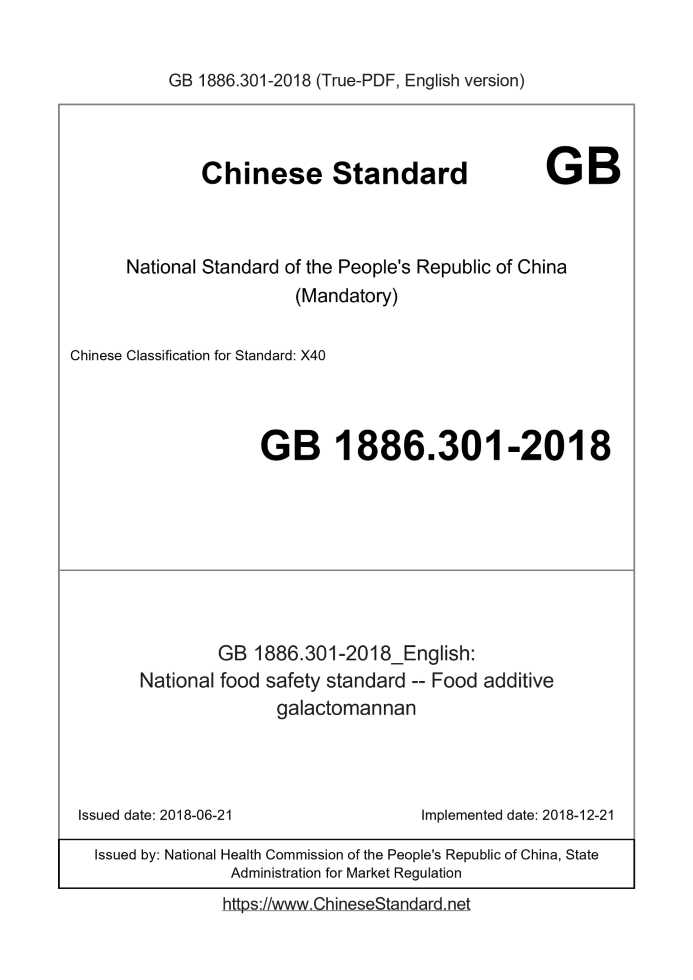 Delivery: <= 3 days. True-PDF full-copy in English will be manually translated and delivered via email. GB 1886.301-2018: National food safety standard -- Food additive galactomannan Status: Valid