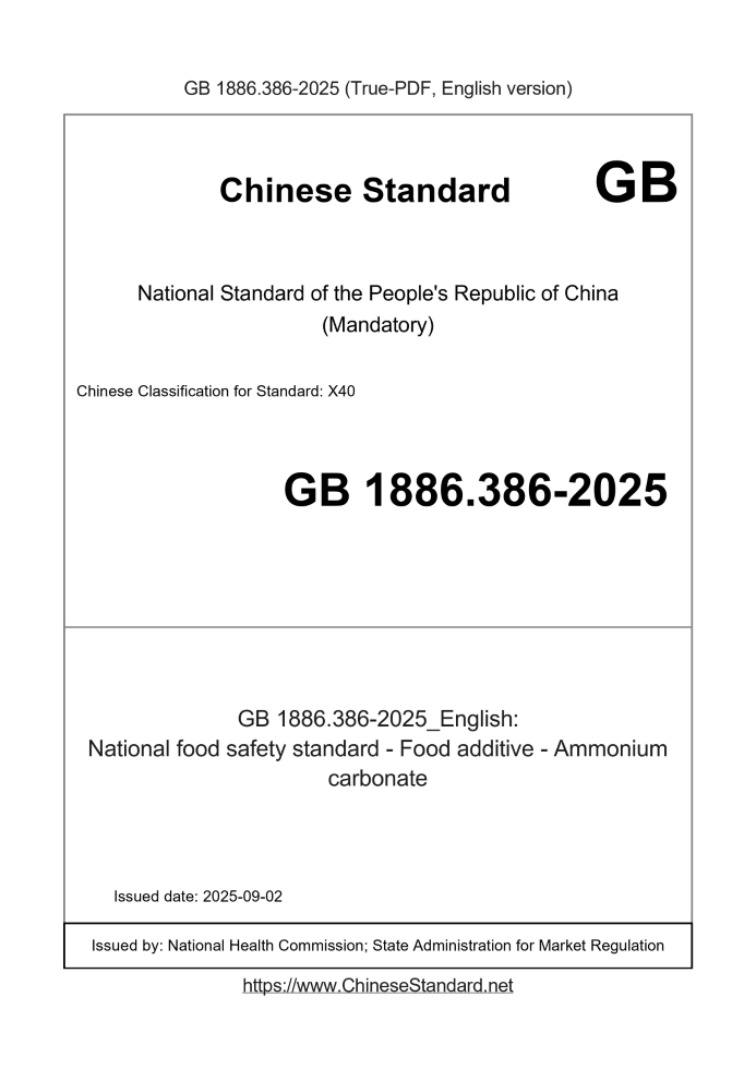 Delivery: <= 3 days. True-PDF full-copy in English will be manually translated and delivered via email. GB 1886.386-2025: National food safety standard - Food additive - Ammonium carbonate Status: Valid