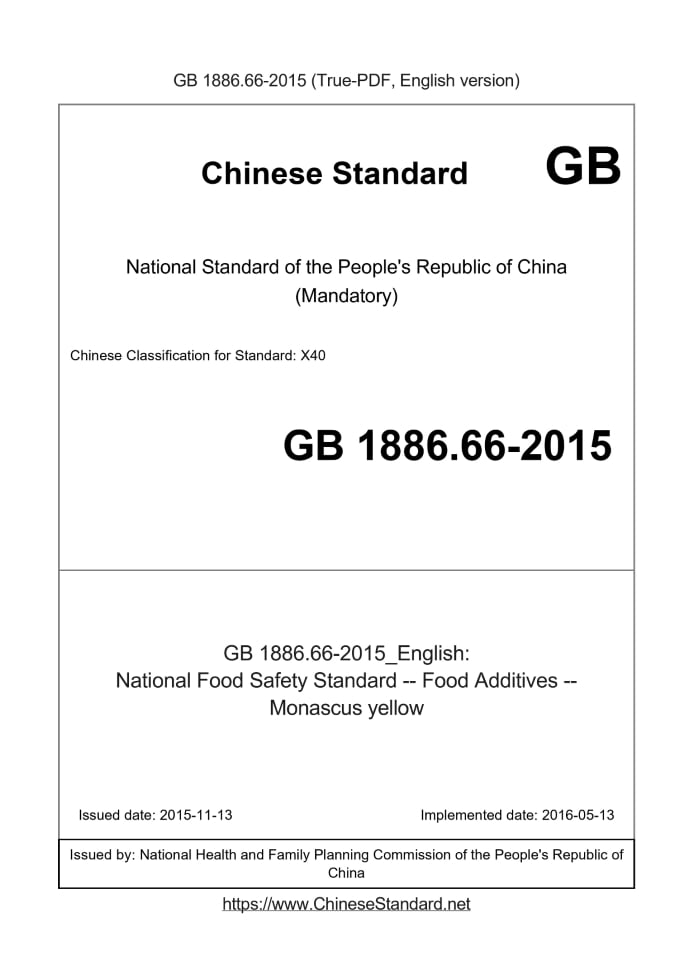 Delivery: <= 2 days. True-PDF full-copy in English will be manually translated and delivered via email. GB 1886.66-2015: National Food Safety Standard -- Food Additives -- Monascus yellow Status: Valid
