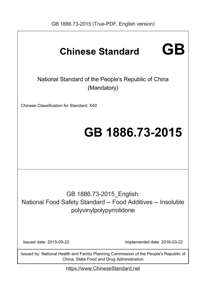 Delivery: <= 3 days. True-PDF full-copy in English will be manually translated and delivered via email. GB 1886.73-2015: National Food Safety Standard -- Food Additives -- Insoluble polyvinylpolypyrrolidone Status: Valid