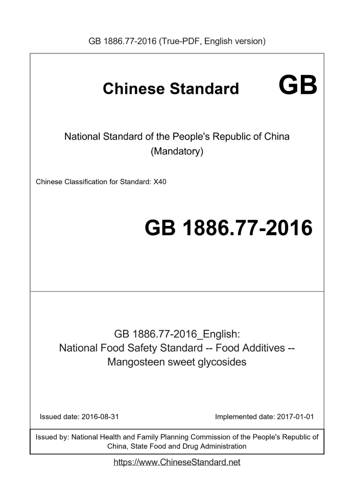 Delivery: <= 3 days. True-PDF full-copy in English will be manually translated and delivered via email. GB 1886.77-2016: National Food Safety Standard -- Food Additives -- Mangosteen sweet glycosides Status: Valid