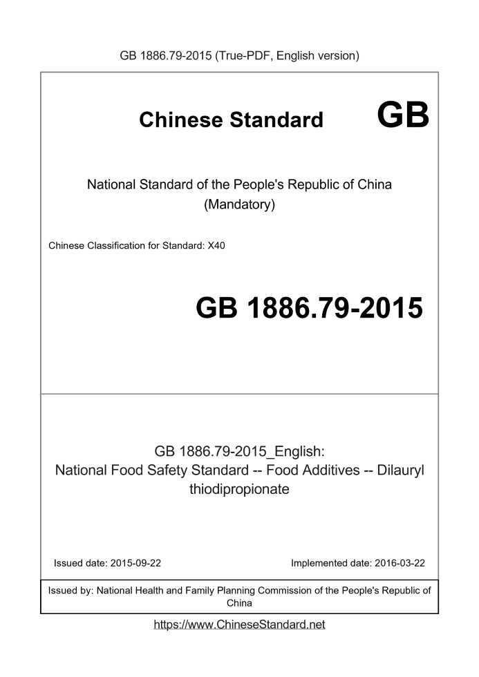 Delivery: <= 2 days. True-PDF full-copy in English will be manually translated and delivered via email. GB 1886.79-2015: National Food Safety Standard -- Food Additives -- Dilauryl thiodipropionate Status: Valid