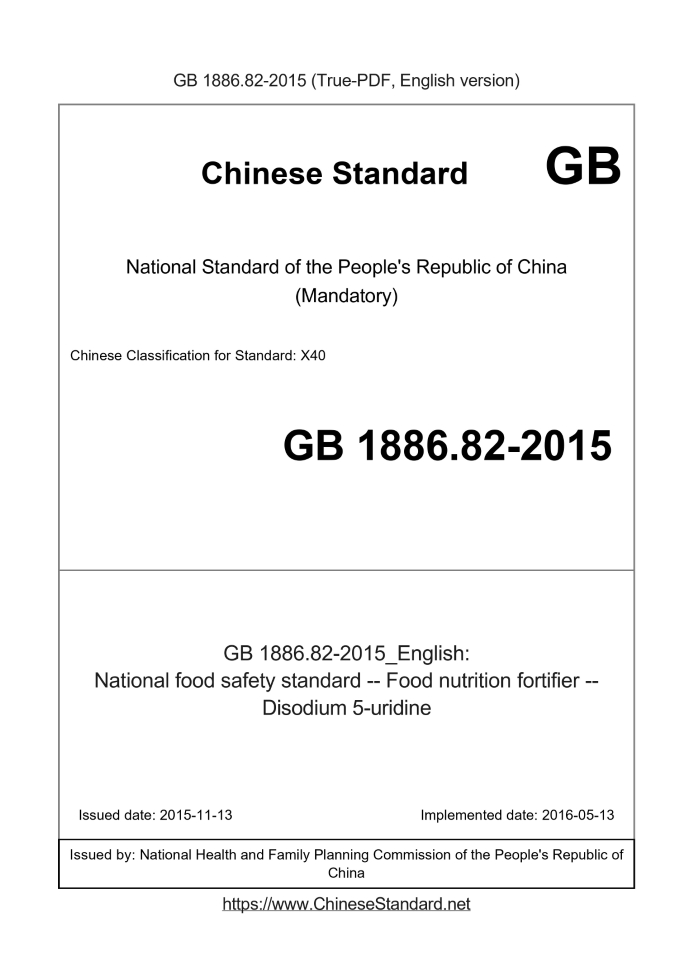 Delivery: <= 3 days. True-PDF full-copy in English will be manually translated and delivered via email. GB 1886.82-2015: National food safety standard -- Food nutrition fortifier -- Disodium 5-uridine Status: Valid