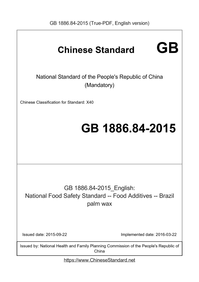 Delivery: <= 3 days. True-PDF full-copy in English will be manually translated and delivered via email. GB 1886.84-2015: National Food Safety Standard -- Food Additives -- Brazil palm wax Status: Valid
