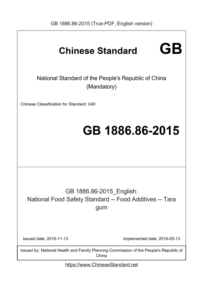 Delivery: <= 3 days. True-PDF full-copy in English will be manually translated and delivered via email. GB 1886.86-2015: National Food Safety Standard -- Food Additives -- Tara gum Status: Valid