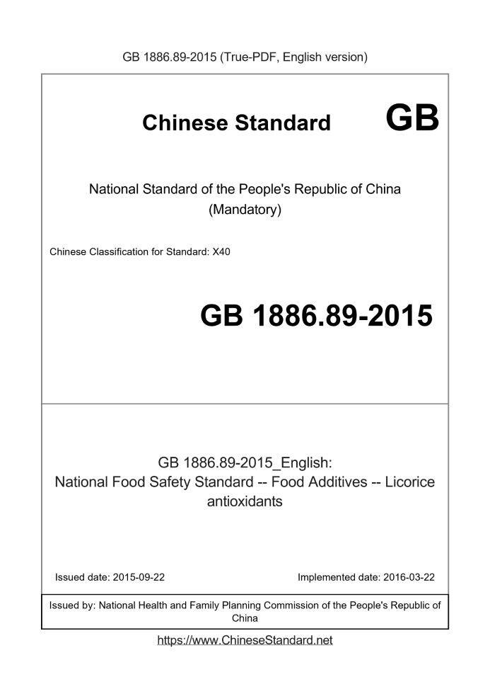 Delivery: <= 3 days. True-PDF full-copy in English will be manually translated and delivered via email. GB 1886.89-2015: National Food Safety Standard -- Food Additives -- Licorice antioxidants Status: Valid
