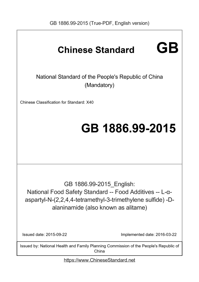 Delivery: <= 3 days. True-PDF full-copy in English will be manually translated and delivered via email. GB 1886.99-2015: National Food Safety Standard -- Food Additives -- L-α-aspartyl-N-(2,2,4,4-tetramethyl-3-trimethylene sulfide) -D-alaninamide (also known as alitame) Status: Valid