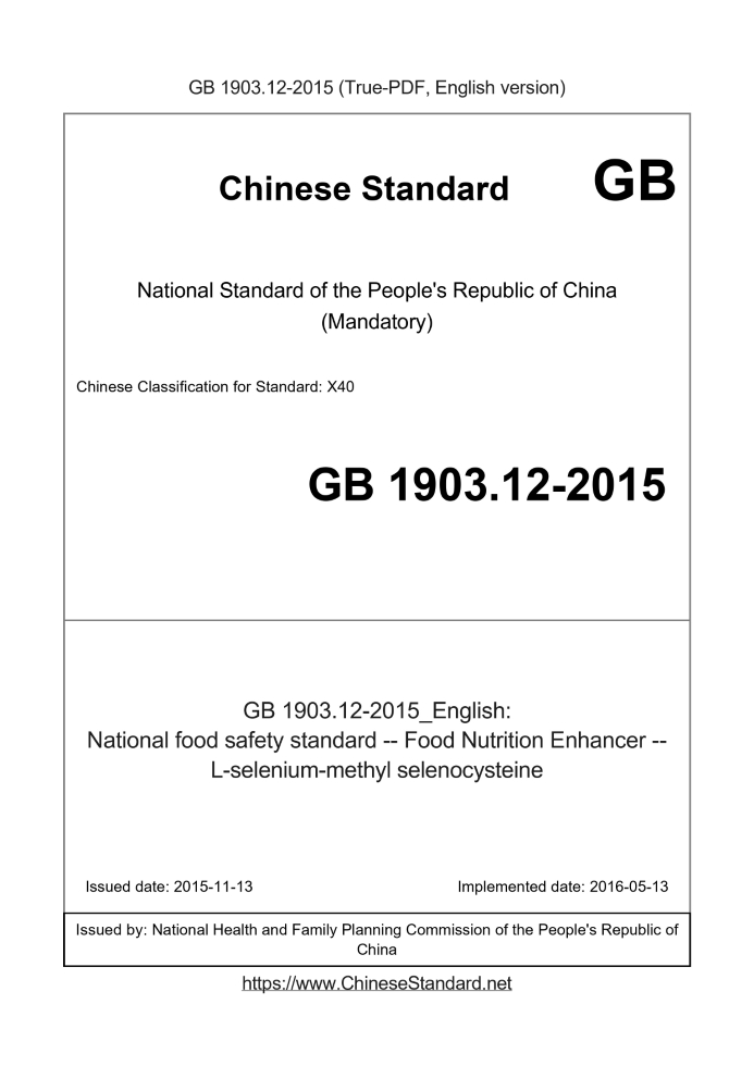 Delivery: <= 3 days. True-PDF full-copy in English will be manually translated and delivered via email. GB 1903.12-2015: National food safety standard -- Food Nutrition Enhancer -- L-selenium-methyl selenocysteine Status: Valid