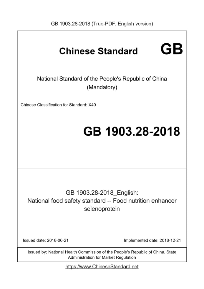 Delivery: <= 3 days. True-PDF full-copy in English will be manually translated and delivered via email. GB 1903.28-2018: National food safety standard -- Food nutrition enhancer selenoprotein Status: Valid