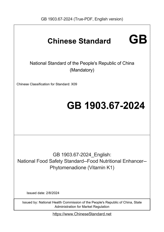 Delivery: <= 3 days. True-PDF full-copy in English will be manually translated and delivered via email. GB 1903.67-2024: National Food Safety Standard--Food Nutritional Enhancer--Phytomenadione (Vitamin K1) Status: Valid