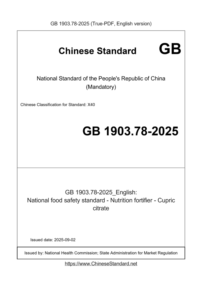 Delivery: <= 3 days. True-PDF full-copy in English will be manually translated and delivered via email. GB 1903.78-2025: National food safety standard - Nutrition fortifier - Cupric citrate Status: Valid