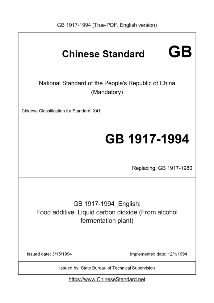 GB 1917-1994: Food additive. Liquid carbon dioxide (From alcohol fermentation plant)