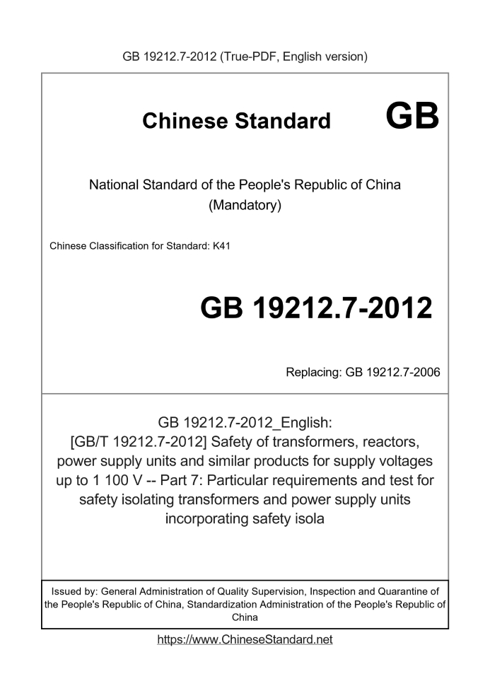Delivery: <= 3 days. True-PDF full-copy in English will be manually translated and delivered via email. GB 19212.7-2012: [GB/T 19212.7-2012] Safety of transformers, reactors, power supply units and similar products for supply voltages up to 1 100 V -- Part 7: Particular requirements and test for safety isolating transformers and power supply units incorporating safety isola Status: Valid GB 19212.7: Historical versions