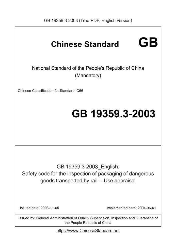 Delivery: <= 4 days. True-PDF full-copy in English will be manually translated and delivered via email. GB 19359.3-2003: Safety code for the inspection of packaging of dangerous goods transported by rail -- Use appraisal Status: Obsolete