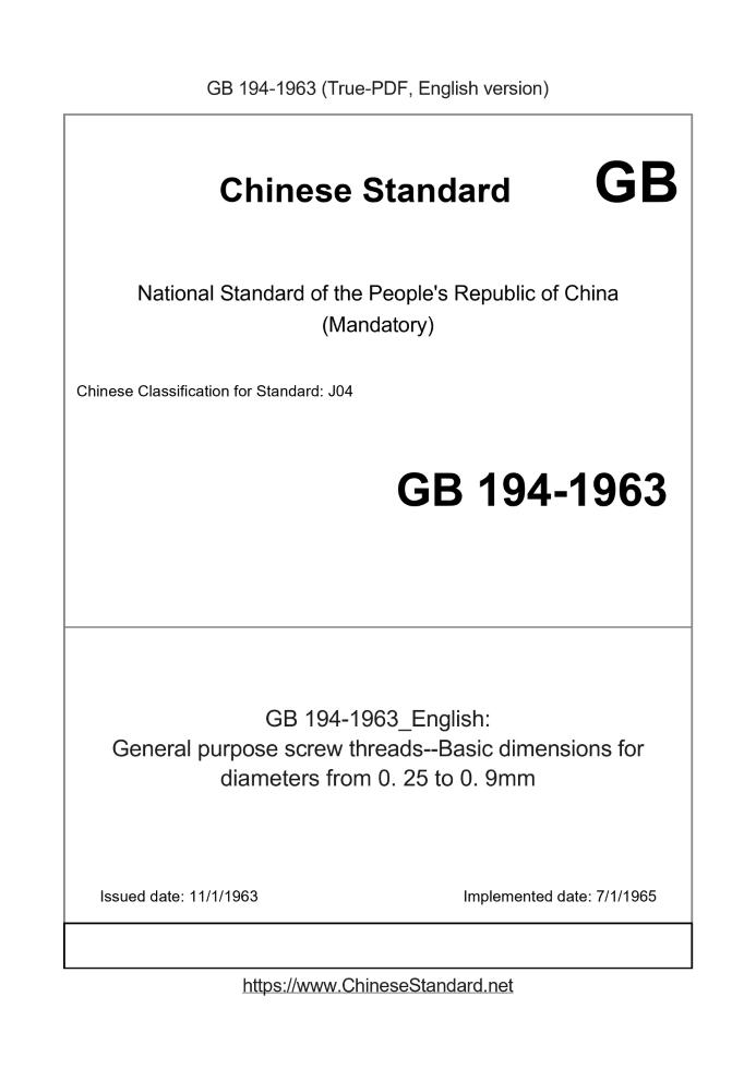Delivery: <= 2 days. True-PDF full-copy in English will be manually translated and delivered via email. GB 194-1963: General purpose screw threads--Basic dimensions for diameters from 0. 25 to 0. 9mm Status: Obsolete