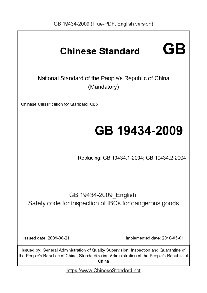 Delivery: <= 3 days. True-PDF full-copy in English will be manually translated and delivered via email. GB 19434-2009: Safety code for inspection of IBCs for dangerous goods Status: Valid GB 19434: Historical versions