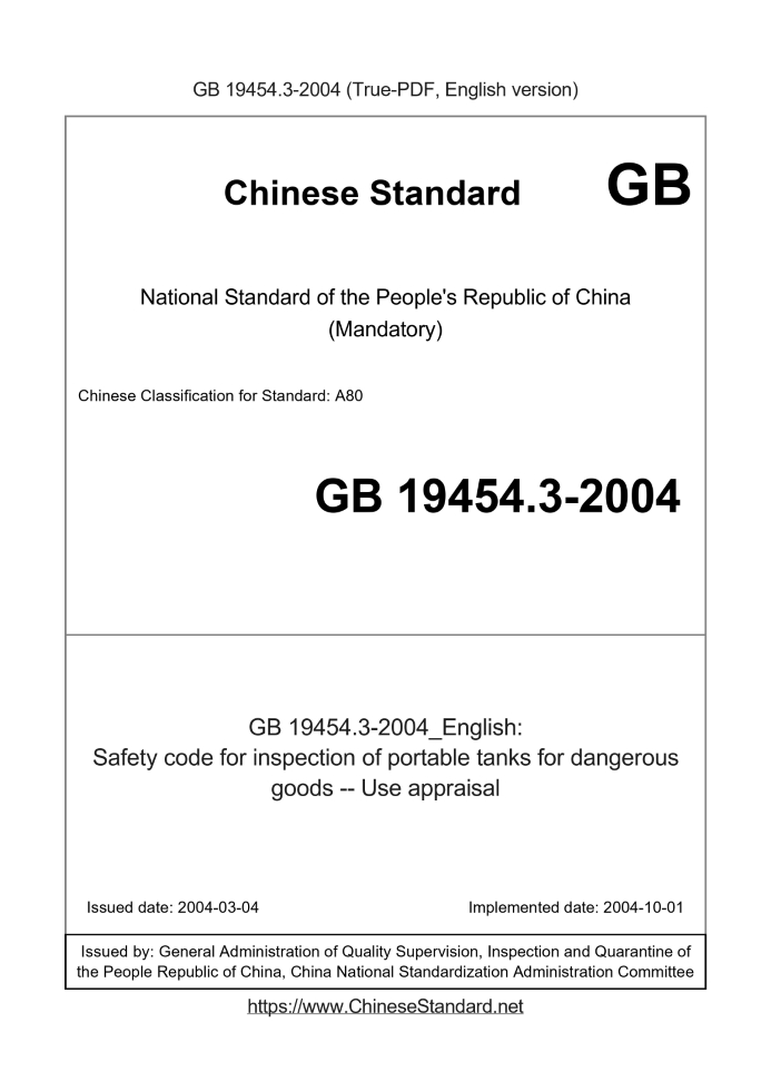 Delivery: <= 3 days. True-PDF full-copy in English will be manually translated and delivered via email. GB 19454.3-2004: Safety code for inspection of portable tanks for dangerous goods -- Use appraisal Status: Obsolete
