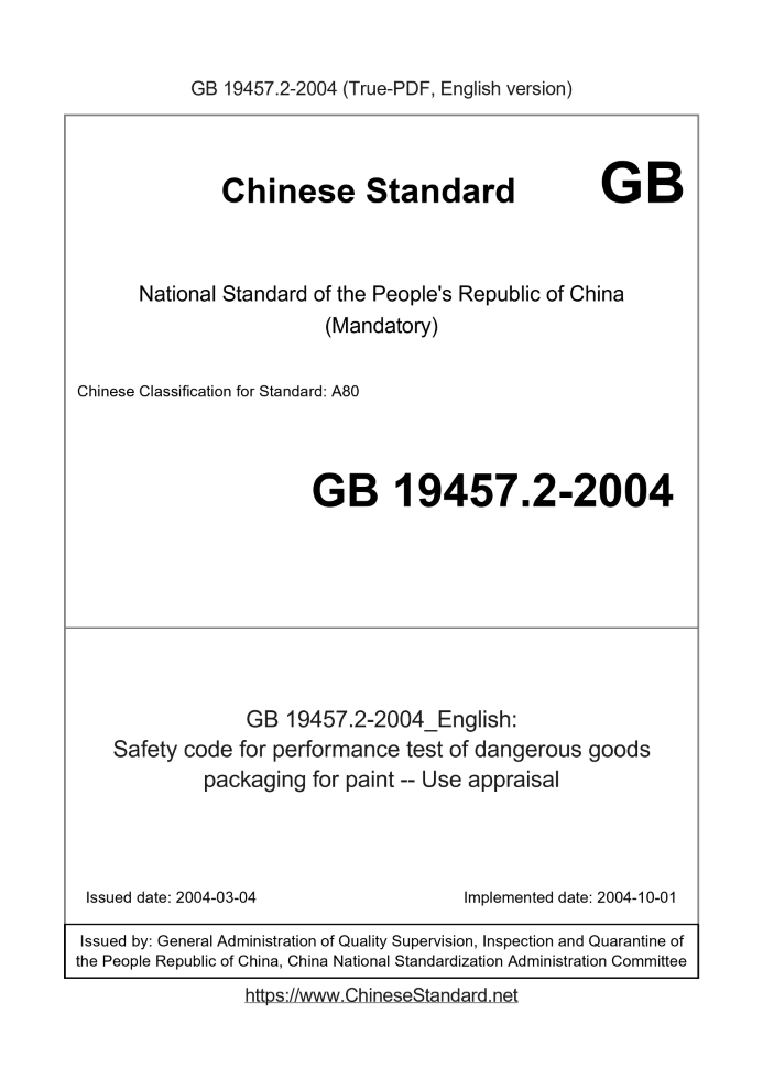 GB 19457.2-2004239 Add to Cart 2 days Safety code for performance test of dangerous goods packaging for paint -- Use appraisal Obsolete