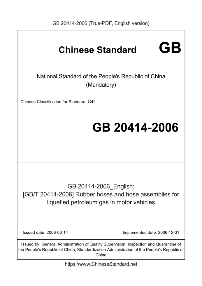 Delivery: <= 3 days. True-PDF full-copy in English will be manually translated and delivered via email. GB 20414-2006: [GB/T 20414-2006] Rubber hoses and hose assemblies for liquefied petroleum gas in motor vehicles Status: Valid